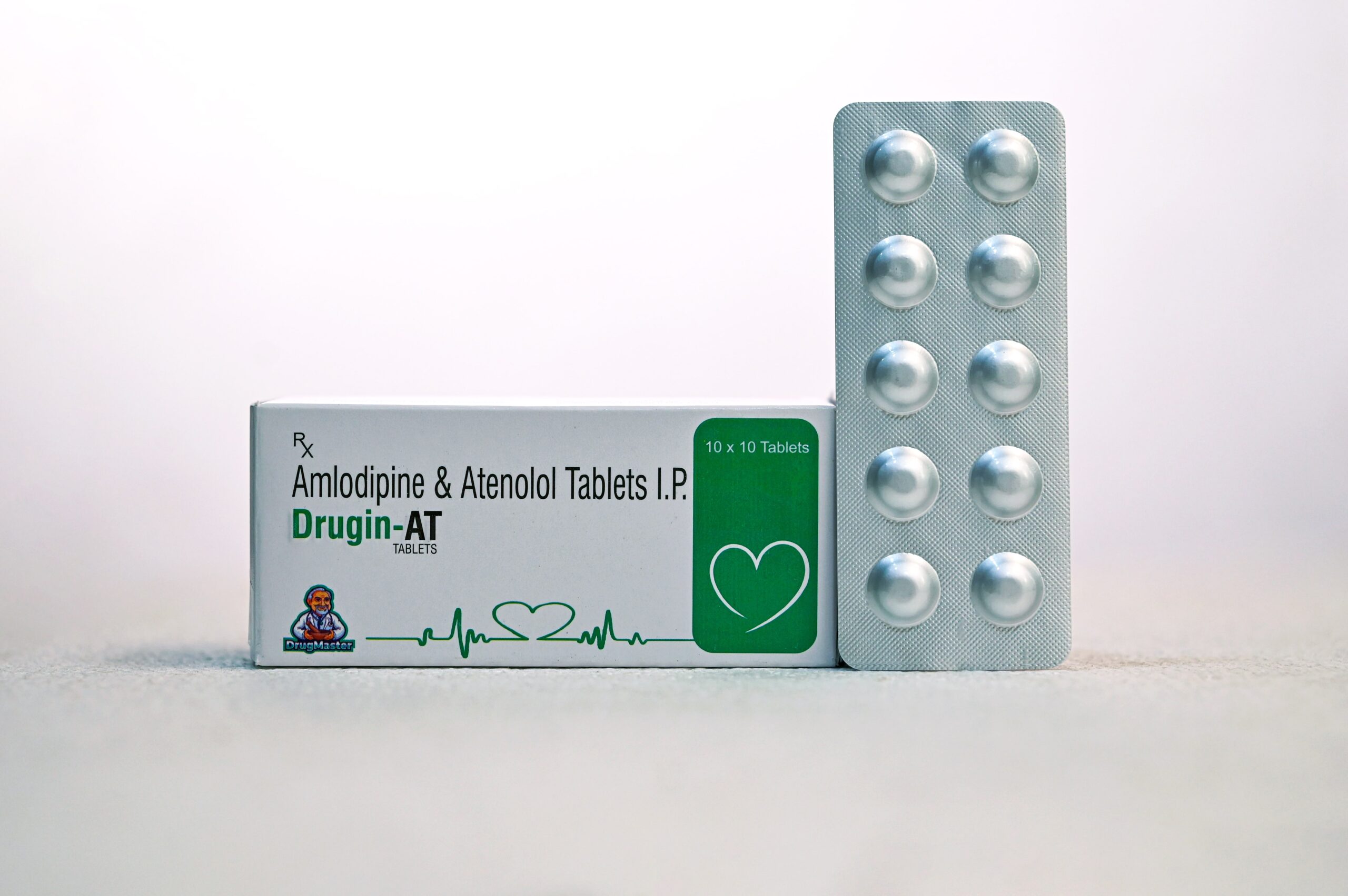 Drugin-AT is a highly effective, prescription combination medicine containing Amlodipine and Atenolol (I.P.). It is specifically indicated for the management of Hypertension (High Blood Pressure) and Angina Pectoris (heart-related chest pain).